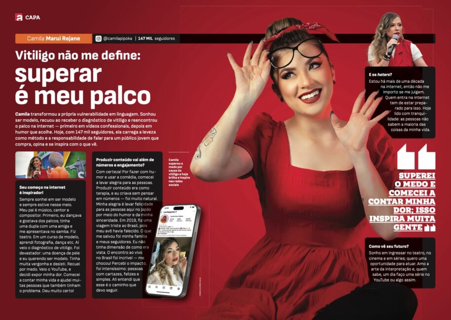 Sempre sonhei em ser modelo e sempre estive nesse meio. Meu pai é músico, cantor e compositor. Primeiro, eu dançava e gostava dos palcos; eu tinha uma dupla com uma amiga e me apresentava no samba. Fiz teatro. Em uma aula de modelo, aprendi fotografia, dança etc. Aí veio o diagnóstico de vitiligo. Foi devastador: uma doença de pele e eu querendo ser modelo; eu tinha muita vergonha e desisti. Recuei por medo. Cheguei a participar do Miss Nikkei em 2006 e, em 2011, ganhei um concurso de Miss. Daí veio o YouTube, e eu decidi expor minha dor. Comecei a contar minha vida e ajudei muitas pessoas que também tinham o problema. Deu muito certo!