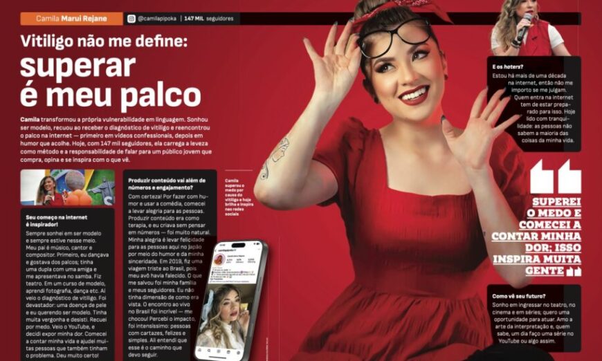 Sempre sonhei em ser modelo e sempre estive nesse meio. Meu pai é músico, cantor e compositor. Primeiro, eu dançava e gostava dos palcos; eu tinha uma dupla com uma amiga e me apresentava no samba. Fiz teatro. Em uma aula de modelo, aprendi fotografia, dança etc. Aí veio o diagnóstico de vitiligo. Foi devastador: uma doença de pele e eu querendo ser modelo; eu tinha muita vergonha e desisti. Recuei por medo. Cheguei a participar do Miss Nikkei em 2006 e, em 2011, ganhei um concurso de Miss. Daí veio o YouTube, e eu decidi expor minha dor. Comecei a contar minha vida e ajudei muitas pessoas que também tinham o problema. Deu muito certo!